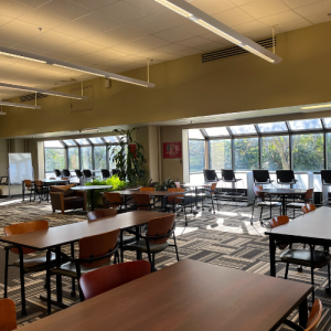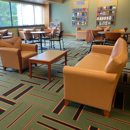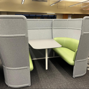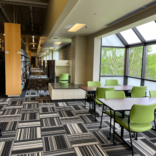 The library has different study spaces for students, including areas for quiet study and group work. You can use tables, chairs, study pods, study carrels, a computer lab, and computer workstations on a first-come, first-served basis. Quiet conversation is allowed on the first floor, while the second floor is a quiet zone.