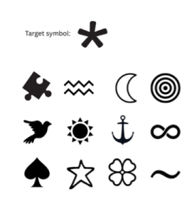| Symbol Search | In this subtest the examinee is shown a target symbol and then told they must determine if this symbol appears in an arrange of different stimuli. They are then presented with multiple symbols that could include their target symbol. Examinee’s must check if their symbol is present in this arrangement. | Is the target symbol in the arrangement?![]() |