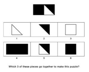 | Visual Puzzle (VSI) | This involves the examinee to view a puzzle and choose which pieces go together to make the puzzle. They are presented with many options that make sense to fit in the puzzle, but they must choose the desired number of pieces needed to correctly complete the task. | Which of these three pieces go together to make the top example? You must choose three. From: (Buckley, 2023) ![]() |