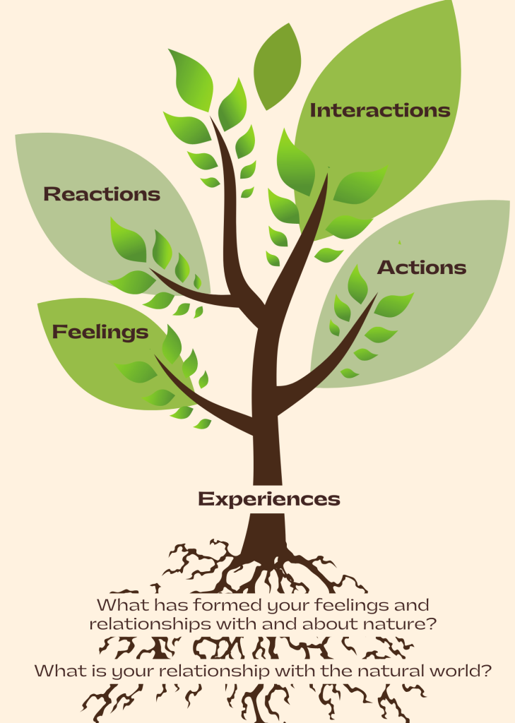 This graphic depicts a tree with it's roots visible and four branches. On each branch there is a large leaf. Beginning with the roots, there are two text boxes overlaid on the roots. The first says 'what is your relationship with the natural world?', the second one says 'What has formed your feelings and relationships with and about nature?'. Moving up, at the base of the tree trunk there is a text box that says 'Experiences'. The first branch and leaf has text that says 'feelings', the next says 'Actions', the third says 'Reactions' and the fourth says 'Interactions'.
