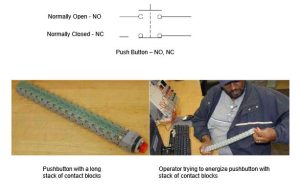 The example of Fig. 2-12 shows a pushbutton with many contact blocks stacked on it. Is this practical? See how hard Eddie must push to energize the pushbutton.
