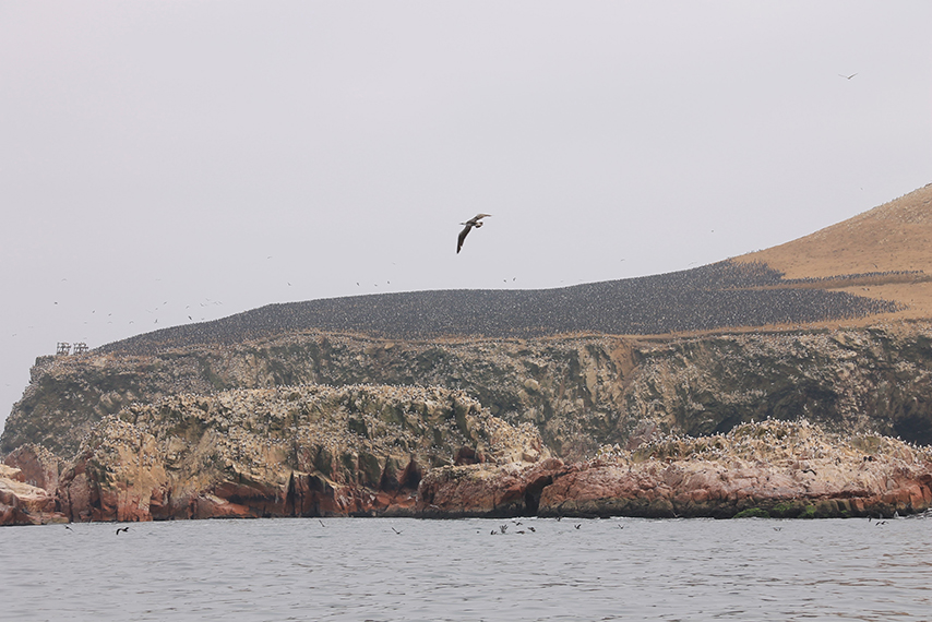 Image 5.4. Where colonial seabirds are abundant, their excrement (guano) can be mined as a source of phosphorus-rich fertilizer. This is a view of a large colony of fish-eating guanay cormorants (Phalacrocorax bougancillii) near Paracas off the coast of Peru. The dried guano is periodically scraped from the rocks and used for agricultural purposes. Source: B. Freedman.