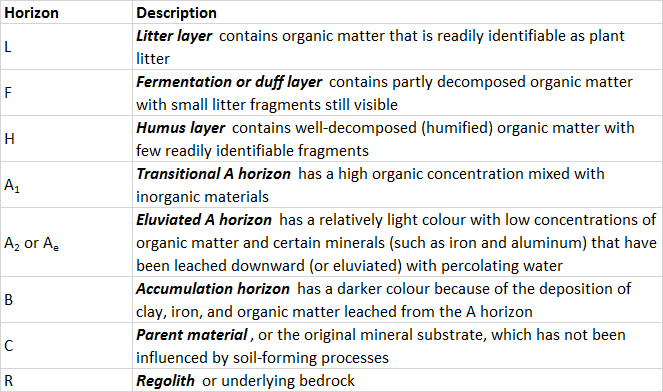 For example, water from precipitation dissolves certain minerals and carries the resulting ions downward. This process, known as leaching, modifies the chemistry and mineralogy of both the surface and deeper parts of the soil. In addition, inputs of litter (dead biomass) from plants increase the content of organic matter in soil. Fresh litter is a food substrate for many decomposer species of soil-dwelling animals, fungi, and bacteria. These organisms eventually oxidize the organic debris into carbon dioxide, water, and inorganic nutrients such as ammonium, although some material remaining as complex organic matter, known as humus. As soils develop, they assume a vertical stratification known as a soil profile, which has recognizable layers known as horizons. From the surface downward, the major horizons of a well-developed soil profile are as follows: