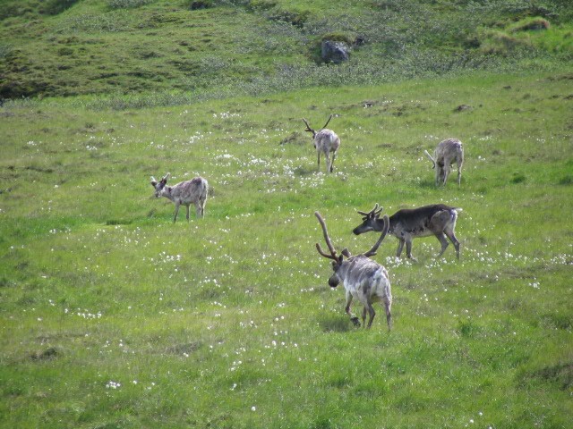 Image 9.4. Species interact with each other in various ways, such as herbivory, predation, competition, disease, and symbiosis. This photo shows caribou (Rangifer tarandus) grazing in a tundra meadow in the Nunavik region of northern Quebec. Source: B. Freedman.