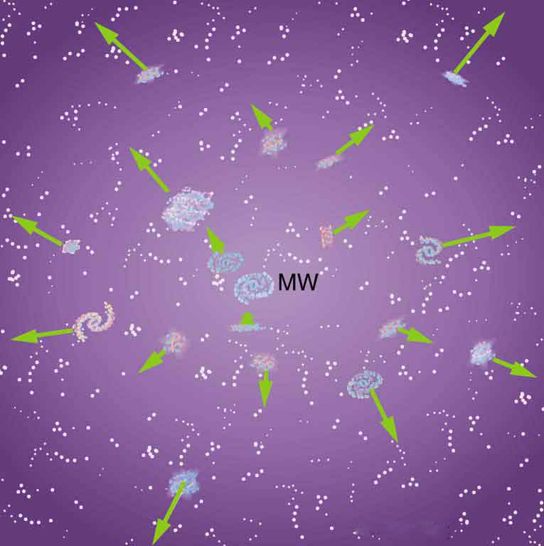 Perhaps the most important characteristic of the universe is that all galaxies except those in our local cluster seem to be moving away from us at speeds proportional to their distance from our galaxy. It looks as if a gigantic explosion, universally called the Big Bang, threw matter out some billions of years ago. This amazing conclusion is based on the pioneering work of Edwin Hubble (1889–1953), the American astronomer. In the 1920s, Hubble first demonstrated conclusively that other galaxies, many previously called nebulae or clouds of stars, were outside our own. He then found that all but the closest galaxies have a red shift in their hydrogen spectra that is proportional to their distance. The explanation is that there is a cosmological red shift due to the expansion of space itself. The photon wavelength is stretched in transit from the source to the observer. Double the distance, and the red shift is doubled. While this cosmological red shift is often called a Doppler shift, it is not—space itself is expanding. There is no center of expansion in the universe. All observers see themselves as stationary; the other objects in space appear to be moving away from them. Hubble was directly responsible for discovering that the universe was much larger than had previously been imagined and that it had this amazing characteristic of rapid expansion.
