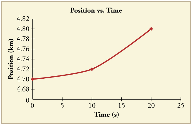 Using approximate values, calculate the slope of the curve in (Figure) to verify that the velocity at \(t=\text{10.0 s}\) is 0.208 m/s. Assume all values are known to 3 significant figures.