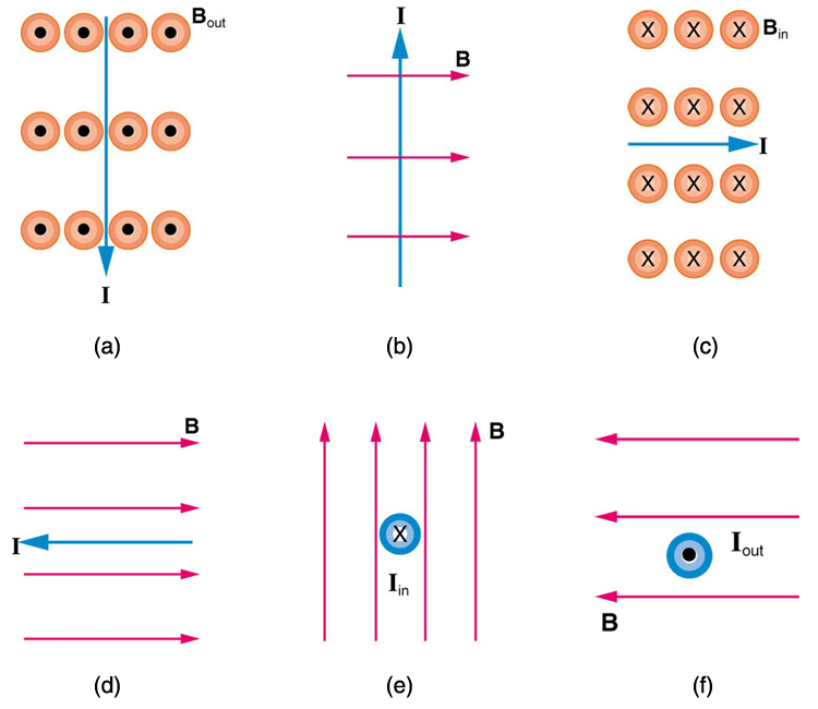 What is the direction of the magnetic field that produces the magnetic force shown on the currents in each of the three cases in (Figure), assuming \(\mathbf{\text{B}}\) is perpendicular to \(\mathbf{\text{I}}\)?
