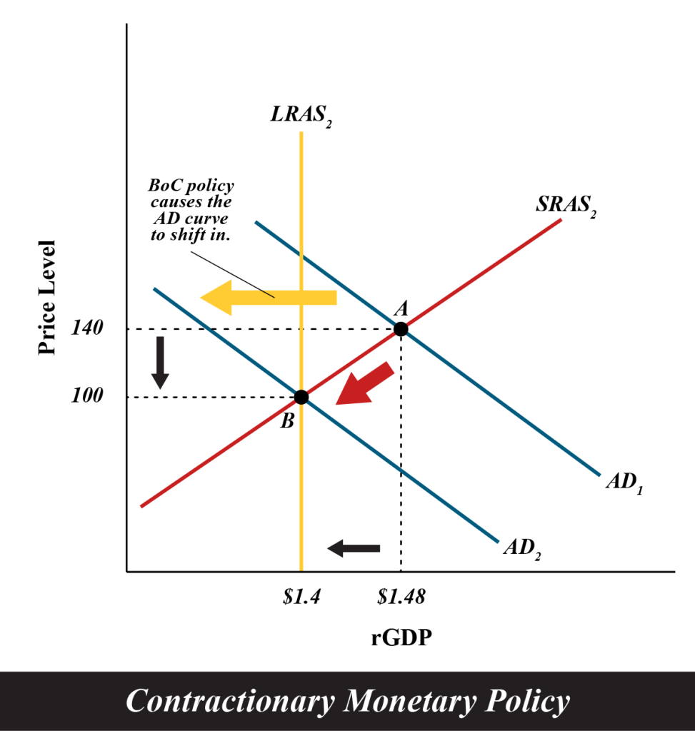 This monetary policy tool of raising the overnight interest rate target and decreasing money supply through an open market operation of selling securities will be conducted when the Bank finds the economy is experiencing inflation. They adopt this policy to lower the price level, which at the same time results in contracting economic growth. Therefore, we call this Contractionary Monetary Policy.