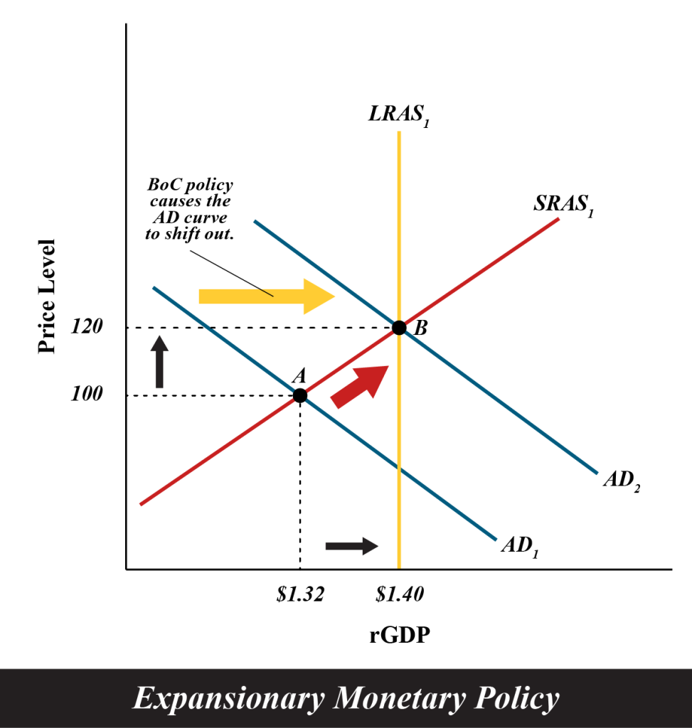 This monetary policy tool of lowering the overnight interest rate target and increasing the money supply through an open market operation of purchasing securities will be conducted when the Bank finds the economy is growing slowly. They adopt this policy to boost economic growth. Therefore, we call this Expansionary Monetary Policy.