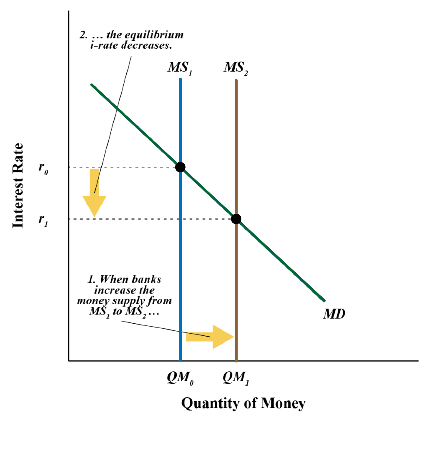 The money market consists of money demand and money supply functions, and the equilibrium in the money market occurs where the money demand curve intersects the money supply curve. In other words, at that point, the quantity of money demand equals the quantity of money supply that determines the equilibrium interest rate and the equilibrium quantity of money. This equilibrium interest rate determined in the money market is the short-term interest rate.