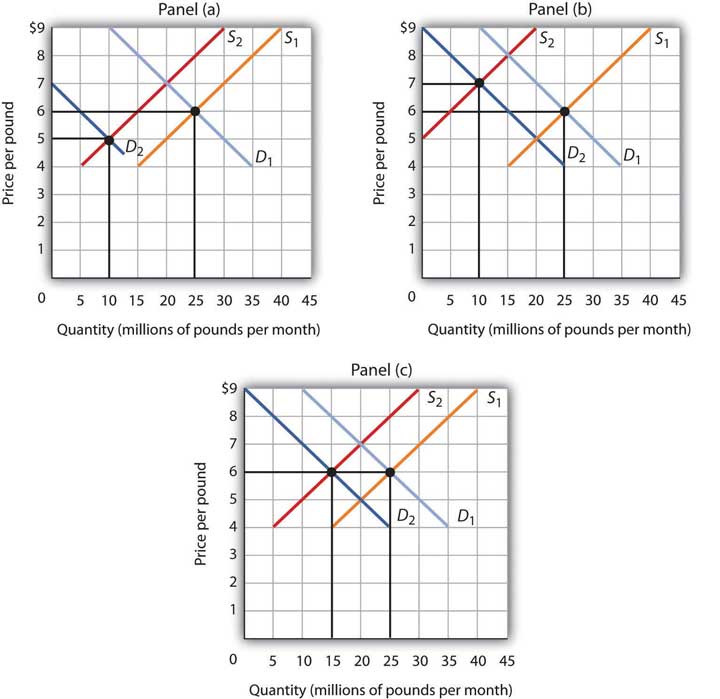 All three panels of Fig 3.15 show a decrease in demand for coffee (caused perhaps by a decrease in the price of a substitute good, such as tea) and a simultaneous decrease in the supply of coffee (caused perhaps by bad weather). Since reductions in demand and supply, considered separately, each causes the equilibrium quantity to fall, the impact of both curves shifting simultaneously to the left means that the new equilibrium quantity of coffee is less than the old equilibrium quantity. The effect on the equilibrium price, though, is ambiguous. Whether the equilibrium price is higher, lower, or unchanged depends on how much each curve shifts.