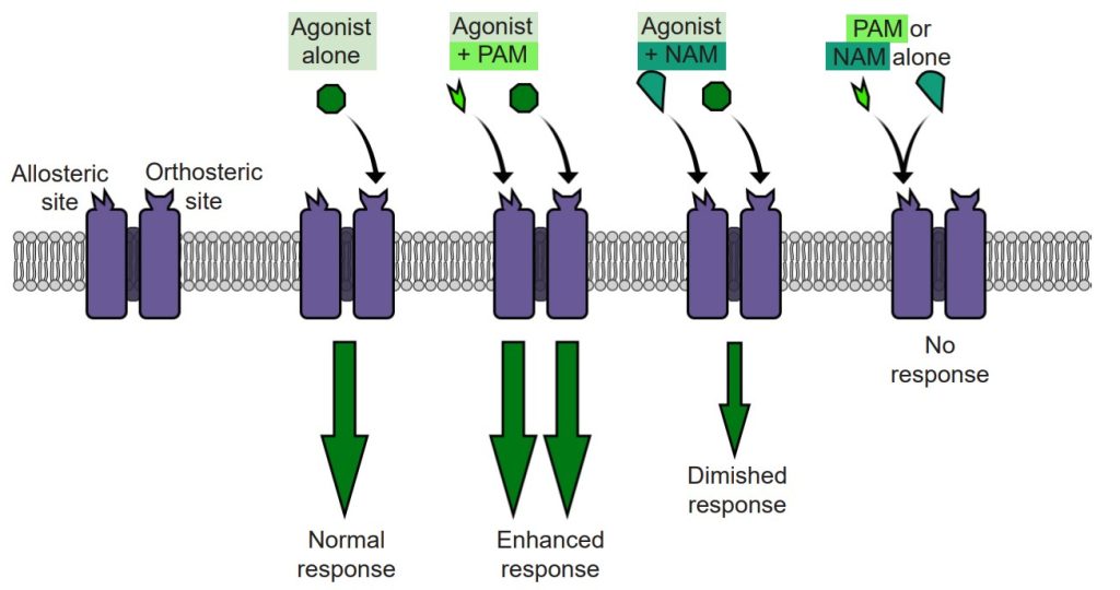 Allosteric modulators act at the level of the receptor to modulate excitability of the neurons. For example, consider an ionotropic receptor that allows Na+ to move across the cell membrane when an agonist is present. When a PAM is present simultaneously with the agonist, more Na+ ions will move across the receptor than if the agonist was acting alone. But, when a NAM is present with that same agonist, fewer Na+ ions will move across the membrane, resulting in decreased excitability.