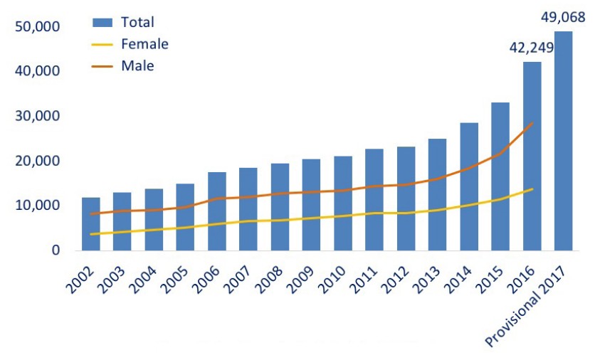 Figure 7.19 Opioid-overdose related deaths in the US have risen steadily over the past few decades, with a steep rise over the past five years.