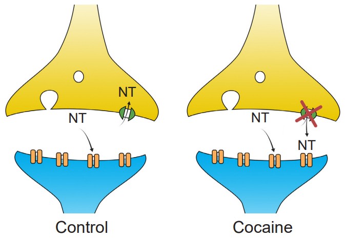 Figure 7.20 Cocaine blocks reuptake of neurotransmitters, increasing signaling.
