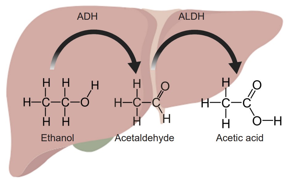 The most common example of metabolic tolerance is seen in frequent alcohol use. The main psychoactive substance found in alcoholic beverages like beer, wine, or liquor is ethanol. Our liver, which filters circulating blood, contains enzymes which break down chemicals in the blood. Specifically, the standard degradation process of ethanol uses two enzymes. The first of which, called alcohol dehydrogenase, oxidizes molecules of ethanol into the toxic byproduct acetaldehyde. The second step uses the enzyme acetaldehyde dehydrogenase to convert the acetaldehyde into acetic acid, a generally harmless compound (the same chemical structure as vinegar) that is used by the body in a biochemical reaction that drives the citric acid cycle. Because most alcohol is taken via oral consumption, ethanol is subject to first-pass metabolism before reaching systemic circulation.