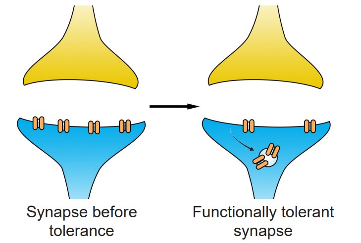 It is good to note that tolerance does not only happen in the presence of agonists like ethanol or morphine. In fact, antagonists are well known to produce tolerance and withdrawal. If you have ever had difficulty staying alert a headache or without your morning coffee, you are experiencing the effects of withdrawal. Caffeine is an antagonist for the adenosine receptors. When the body is used to a certain amount of caffeine that blocks adenosine signaling, there are mechanisms that lead to homeostatic upregulation of adenosine receptors. And so when caffeine is no longer present, the endogenous levels of adenosine overactivate adenosine signaling, leading to the withdrawal symptoms.