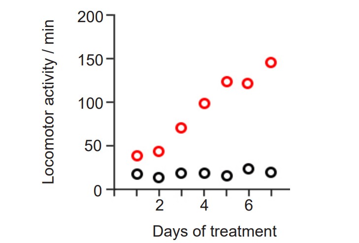 Figure 7.24 A rat exposed to amphetamine over multiple days shows locomotor sensitization, an increase in activity in response to drug.
