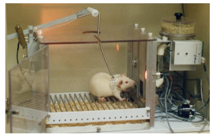 Figure 7.8 An operant conditioning chamber, where pushing a button or lever results in a response such as electrical activation of the brain.