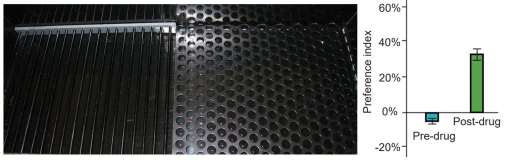 A second experimental test created to study drug abuse is called conditioned place preference (CPP). A CPP test works on the principle that animals learn to associate certain environments with positive feelings, and will prefer to spend significantly more time in those environments. To conduct CPP, a three-room testing chamber is used. This experimental chamber has two large rooms, each with characteristics that are unique to that room. For example, one room may have mesh flooring with dark-colored walls, while the other room may have woodchip flooring with light-colored walls. The two rooms are connected by a smaller, neutral room, and the rooms can be isolated from another by means of a dividing door. To conduct CPP, an animal will be given the drug of interest, then placed into one of the two rooms, where they are free to explore the room, but cannot leave. As a control, at a different time, they will be injected with an innocuous solution and placed into the other room. On test day, the animal will be put into the neutral middle room and given the opportunity to move freely between the two chambers. If the animal developed positive associations with the room where they experienced the drug effect, then they will choose to spend significantly more time in that room. On the other hand, if they experienced negative feelings associated with that room, they will avoid being in the room. Whereas self-administration assesses “drug seeking,” CPP measures “drug liking.”