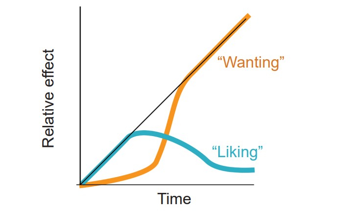 Figure 7.28 The incentive sensitization model suggests a difference between “wanting” and “liking” the effects of a drug.