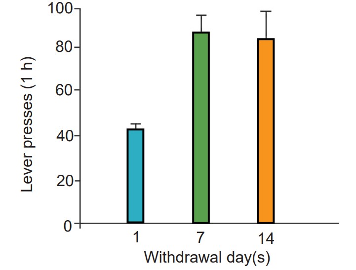 Figure .729 In a self-administration paradigm, lever pressing increases the longer an animal is abstinent from drug.