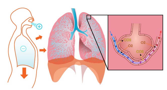 Physiologically, the lungs are extremely effective at transporting inhaled gases into the bloodstream, the same process that allows us to capture oxygen from the air and expel carbon dioxide as we exhale. Gas exchange occurs at the pulmonary capillaries, the dense network of blood vessels that surrounds the alveoli of the lungs. Inhaled air fills these alveoli and exchanges gases in the time span of each breath. This remarkable efficiency of exchanging inspired gases with the dissolved gases in the bloodstream provides one of the major clinical advantages of inhalation as a route of administration, especially during surgery. Inhalable anesthetics are very quickly cleared out of the body when a person goes from breathing the anesthesia to breathing normal air. Breathing is also one of the most natural, unconscious functions that our body possesses, which makes inhalation a very convenient route of administration.