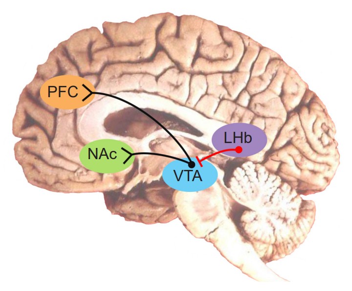 If the VTA to NAc projection is the reward pathway, the projections between the neurons in the lateral habenula (LHb) to the VTA is the “anti- reward” pathway. The LHb sends inhibitory GABA projections onto the VTA DA neurons, so when an aversive stimulus is presented, the LHb neurons increase in their activity, which decreases DA neuron excitability through GABA release, thus resulting in less DA in the NAc. These results were conducted with electrophysiological techniques and first demonstrated in monkeys in 2009. The researchers found that when a monkey was given a squirt of delicious fruit juice, LHb neurons spiked less, which relieved the inhibition on the VTA neurons, allowing them to increase in spiking – as can be expected when a rewarding stimulus is presented. On the other hand, when an aversive stimulus was presented, in this case an air puff to the face, the LHb increased in activity while the VTA neurons decreased in activity. Relatedly, if an animal is trained to expect a reward after some innocuous stimulus (Pavlovian conditioning), and that reward is withheld after presentation of the stimulus, the LHb increases in activity.