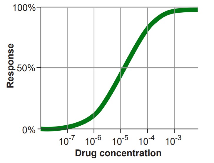 It is also helpful to become familiar with the dose-response curve, which is a graph that plots the activation of a receptor on the y-axis, and increasing dosage of a drug on the x-axis. In most cases, as neurotransmitter concentration increases, so does the activation of the corresponding receptor. The shape of the dose-response curve is described as sigmoidal, the S-shaped curve that is common to many fields of science, including ecology, microbiology, physics, and chemistry.