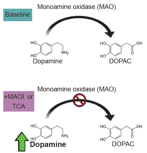 Figure 8.12 MAOIs and TCAs both increase neuronal signaling by decreasing the metabolic degradation of neurotransmitters, such as dopamine.