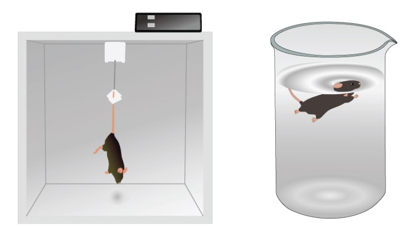 Figure 8.14 The tail suspension test (left) and the forced swim test (right) are despair-based tests that assess depression-like behaviors in non-humans.