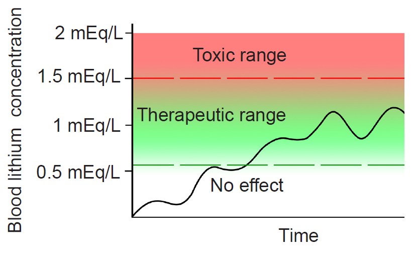 Figure 8.16 Therapeutic drug monitoring is important for people taking lithium for BPD since the medication is ineffective at low doses, but toxic at high doses.