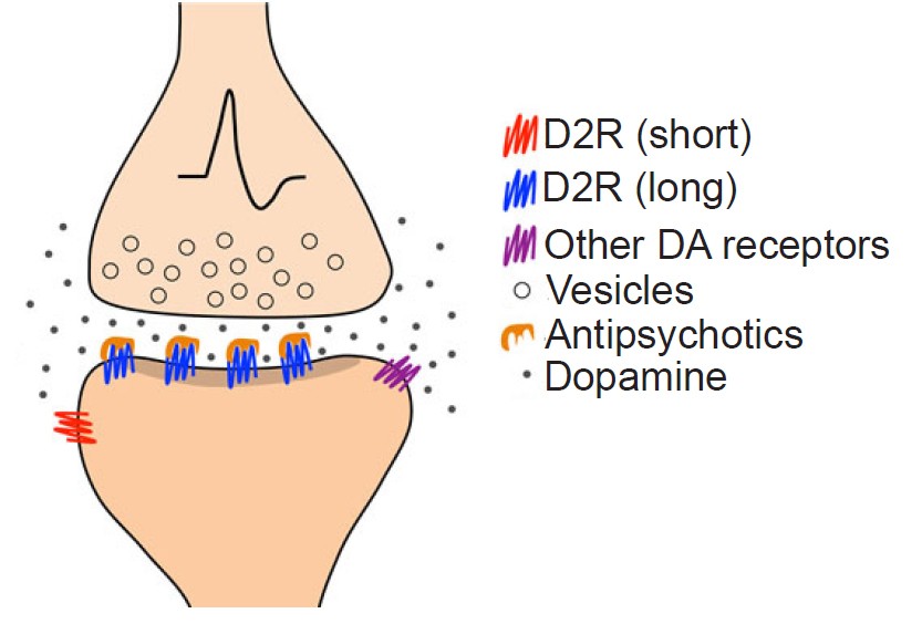 In a healthy person, dopamine is important for motor control and motivation, two behaviors that are changed in patients with SZ. Therefore, scientists have suggested that abnormal dopamine signaling may be an underlying root cause. While the dopamine hypothesis is one of the earliest theories of SZ, modern genetics studies have shown that polymorphisms in the dopamine D2 receptor are risk factors.