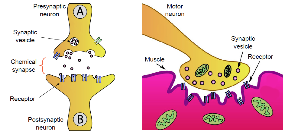 Figure 5.4 Chemical synapses are the site of close interaction between two neurons (left) or a motor neuron and a muscle fiber, which is called the neuromuscular junction (right).