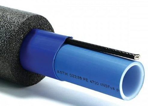 When installing water service pipes it’s important to bury them below the frost line (approximately 4’ deep), this isn’t always possible due to shallow bed rock in some areas. Cottages in Muskoka Ontario only have about 1 foot of ground cover before bed rock, in these areas it’s important to install some type of freeze protection. Below is an example of a water service pipe that is insulated with a type of Styrofoam and then has a jacket on the outside of the insulation. This specific type of pipe and insulation comes as an assembled package and is normally quite expensive. Similar products can be bought and assembled on site costing less.