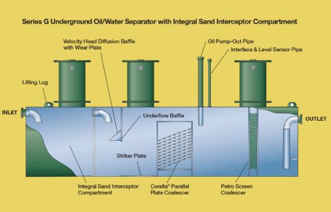 The interceptor provides the container through which the discharge must pass. The flow must be slowed down (control fitting) to allow heavy sand and dirt to settle to the bottom and oil to separate from the water and rise to the top.
