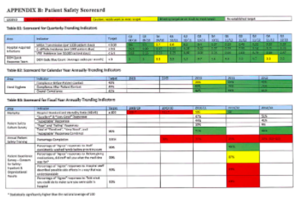 Looking at indicators in a graphical format helps to show easily where an organization is meeting targets and where they are not. Histograms are particularly helpful in simplifying this data. The tables (shown below) Appendix B: Patient Safety Scorecard, shows the different components of safety that are measured and whether or not these indicators are meeting current targets. The scorecard gives a very easy to read of problem areas and areas where the organization is meeting and exceeding expectations.