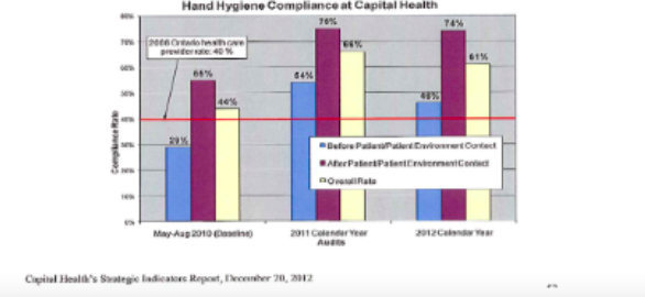 Periodic reporting to Laboratory Management is the final internal assessment component. Management needs to gather data and information about the QMS and its overall performance. Internal and external assessments, non-confirming events and customer feedback are all valuable sources of how effectively the whole system is working. The following information on Hand Hygiene compliance would be one example of this type of monitoring.