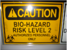Bio-hazard signs are placed on all entry doors into each MLT lab at Waterfront campus. Credit: NSCC / W. Bryan. - Communication – the facility requires a means of communicating with all personnel in a timely manner in the event of an emergency. Fire bells that have different signals for different conditions are used in many organizations and email is used in situations where it is important to get a universal message to all employees, although it may not be urgent for everyone to hear it for safety reasons. Email is also used to communicate when details of the emergency are needed for ongoing response. In some laboratories, a loudspeaker system that carries through the facility may be used to transmit additional information as well.