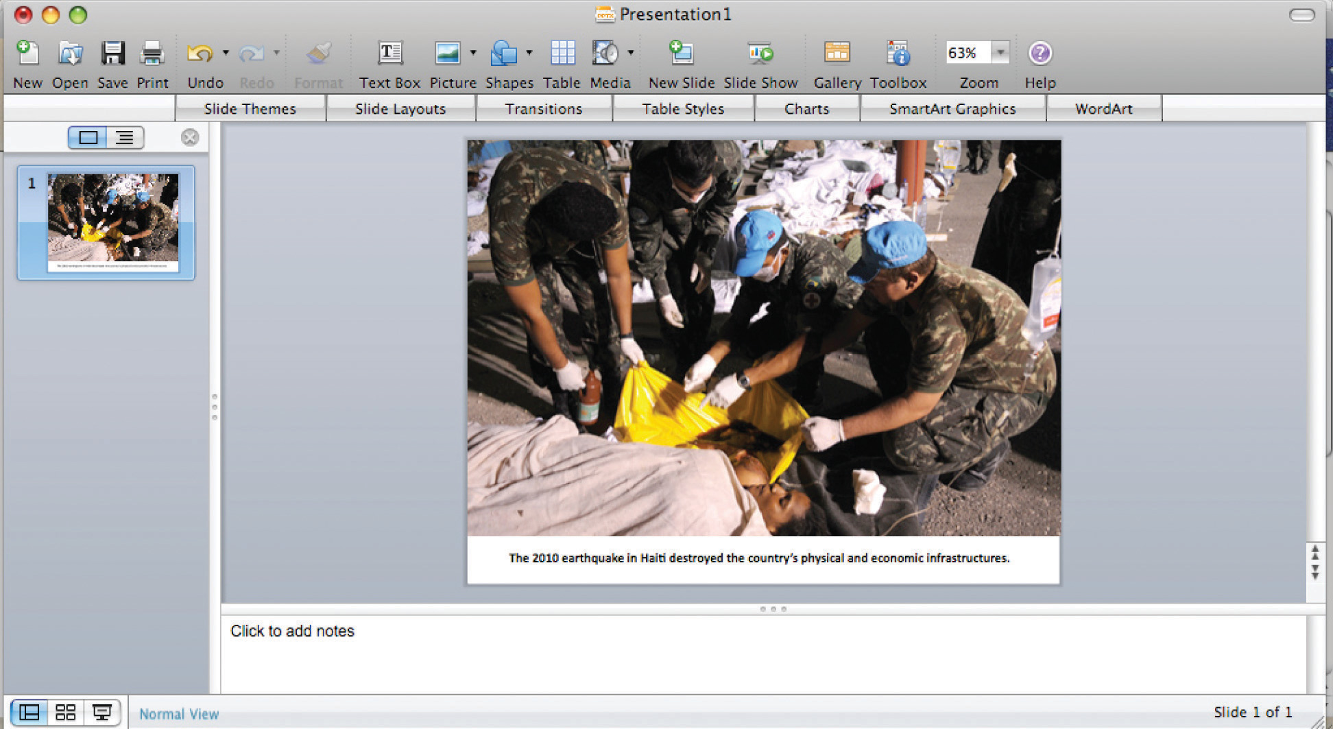 Even if your presentation addresses a less dramatic subject, you can still use images to draw in your audience. Consider how photographs, an illustration, or a video might help your audience connect with a particular person or place or bring a historical event to life. Use visual images to support descriptions of natural or man-made phenomena. What ideas lend themselves to being explained primarily through images?